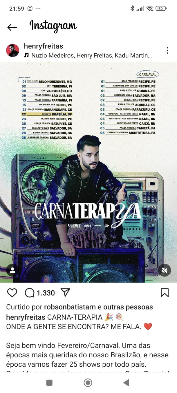 Ocorre que vazou pelas redes sociais um show contratado pelo poder público. Foi o de Henry Freitas. Ele tocará em dois polos de eventos da cidade no dia 04.