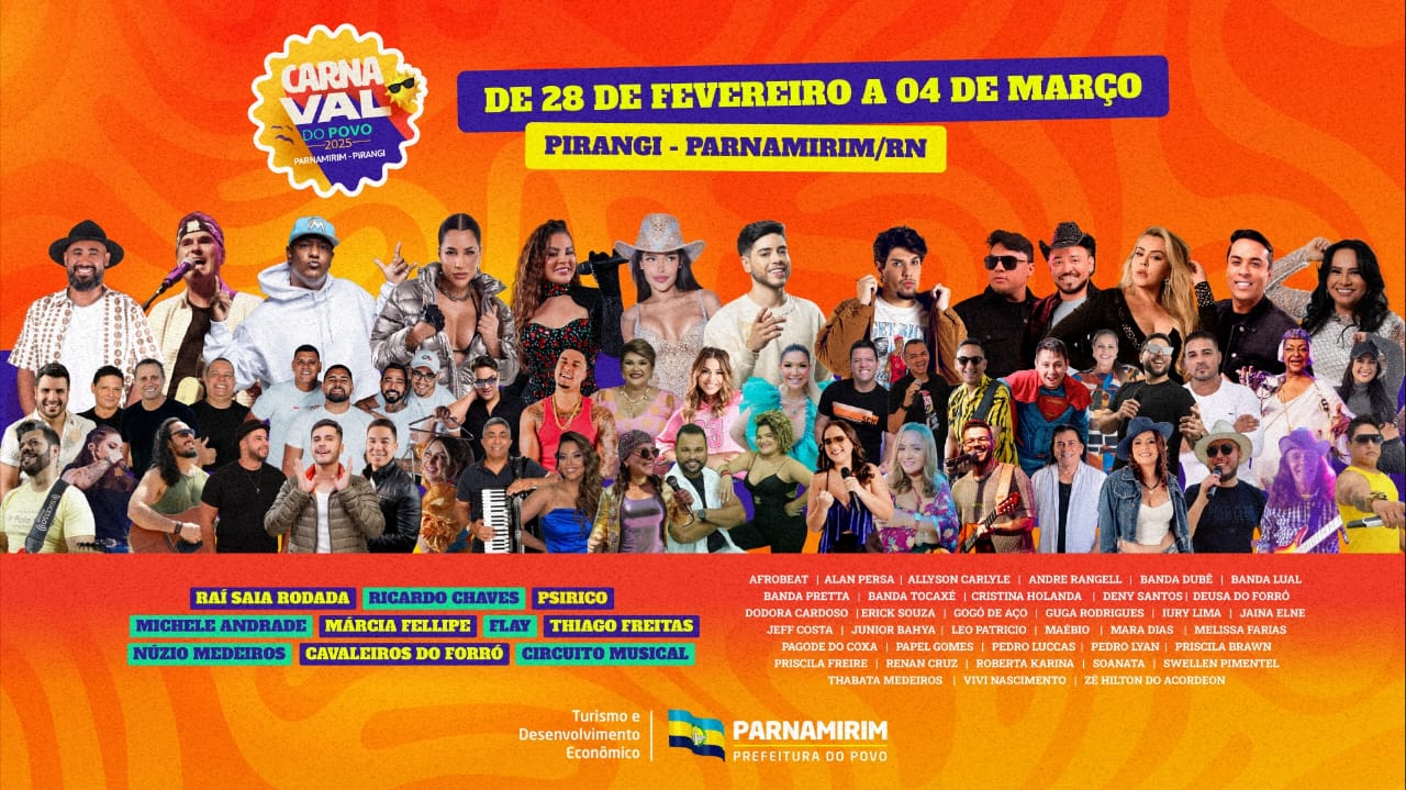 A Prefeitura de Parnamirim divulgou a programação oficial do Carnaval 2025! O tradicional evento será realizado na Praia de Pirangi, um dos principais e mais badalados pontos turísticos de todo o Rio Grande do Norte.