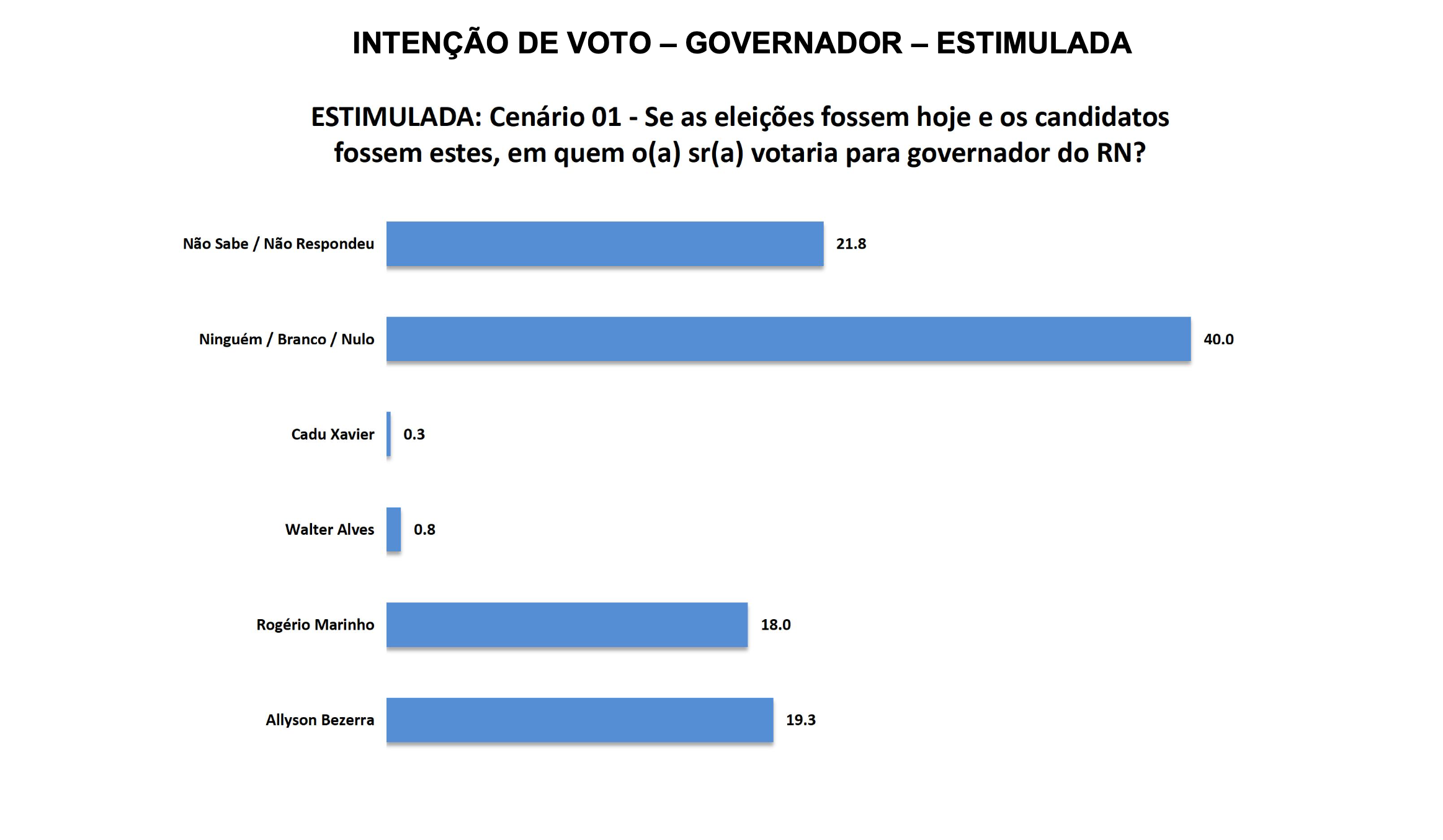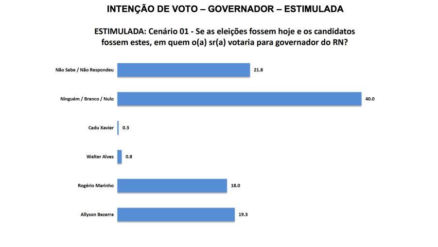 O prefeito de Mossoró Allyson Bezerra lidera a intenção de voto para governador na cidade de Touros. Ele aparece com 19,3%, enquanto Rogério Marinho soma 18%.