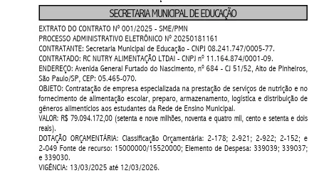 O contrato tem vigência até 12 de março de 2026. De acordo com a SME, a empresa é “especializada na prestação de serviços nutricionais e no fornecimento de alimentação escolar, preparo, armazenamento, logística e distribuição de gêneros alimentícios aos estudantes da Rede de Ensino Municipal”.