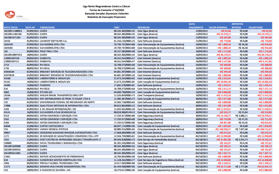 Por fim, o senhor Roberto Duarte, em outro ofício, enviado agora no dia 9 de Junho de 2023 ao senador Styvenson informa que o repasse do recurso referente ao termo de fomento 10/2022 celebrado entre a instituição e a secretaria municipal de saúde de Natal foi objeto de prestação de contas. É informado que a planilha referente ao termo de fomento 10/2022 com o relatório de execução financeira segue em anexo.