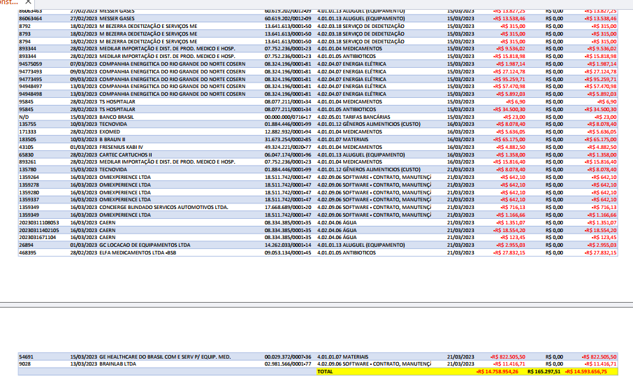 Agora, confronte a informação do portal da transparência do senador com o termo de fomento 10/2022, uma planilha de execução da mesma emenda de 14 milhões e 593 mil enviada pelo senador Styvenson. Nessa planilha, é possível constatar que nada do executado está relacionado a construção de um hospital, mas a manutenção de atividades de saúde - aluguel e compra de insumos e equipamentos, pagamento de conta de energia, telefone e diversas outras despesas.