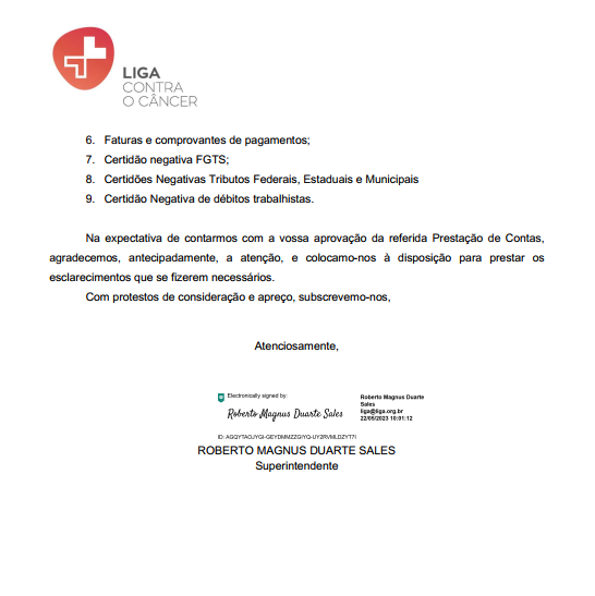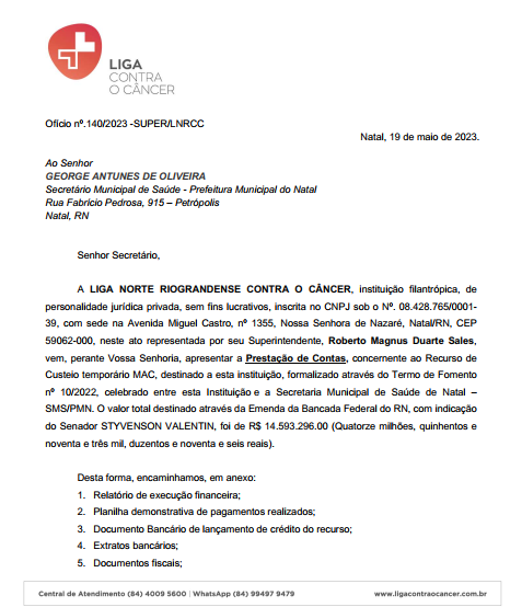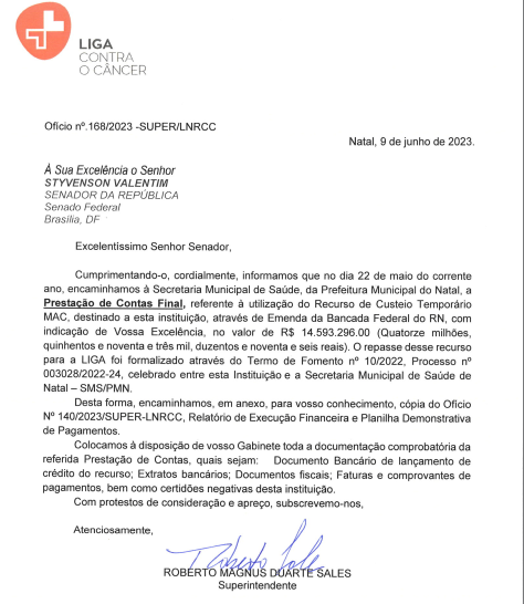 Posteriormente, relacione ao ofício enviado institucionalmente pela Liga e assinado pelo superintendente da Liga Contra o Câncer, o Senhor Roberto Duarte - o que deu entrevista à imprensa no último dia 23 -, assegurando que, através do envio de documentos, ele está prestando contas ao senador Styvenson no dia 19 de Maio de 2023 a respeito da emenda de 14 milhões e 593 mil reais. No ofício há afirmação insofismável - "Recurso de Custeio Temporário Mac".