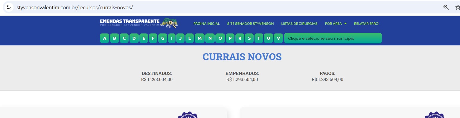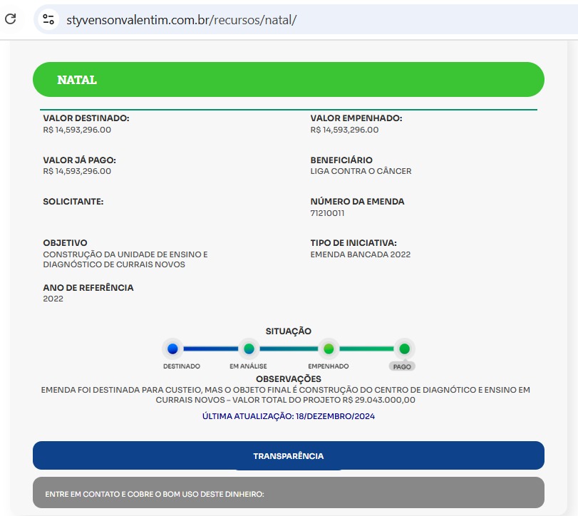 O senador Styvenson Valentim fez uma prestação de contas em seu próprio portal. Nele, é possível encontrar a descrição da emenda que seria de custeio no valor executado de 14.593.296,00. Diz expressamente o seu portal da transparência - "emenda foi destinada para custeio, mas o objeto real é construção do centro de diagnóstico e ensino em Currais Novos - valor total do projeto 29.043.000,00".