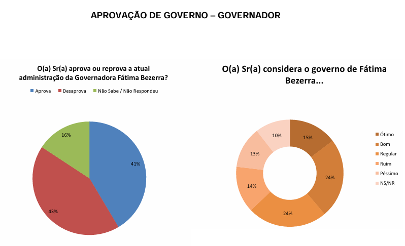 Aprovação de Governo – Governador: Perguntado sobre como considera o governo da governadora Fátima Bezerra: Ótimo (15%), Bom (24%), Regular (24%), Ruim (14%), Péssimo (13%) e Não Sabe / Não Respondeu (10%).