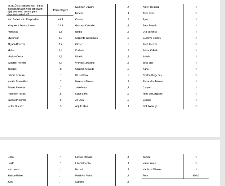 Espontânea: Na pesquisa espontânea para Deputado Estadual, os mais citados foram: Francisco do PT (3,5%), Styvenson Valentim (1,9%), Allyson Bezerra (1,7%), Kleber Rodrigues (1,4%), Vivaldo Costa (1,3%) e Ezequiel Ferreira (1,1%).