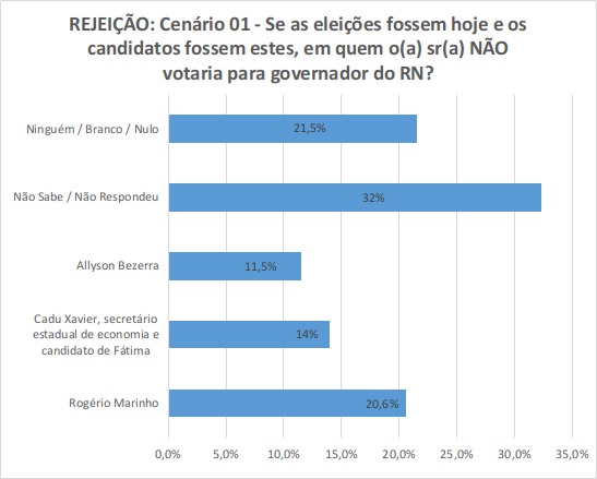 Rejeição de voto/Governador – Estimulada: O atual senador Rogério Marinho é o nome mais rejeitado entre os eleitores entrevistados, com 20,6% das intenções de voto, seguido por Cadu Xavier (14%) e Allyson Bezerra (11,5%); Não Sabe/Não Respondeu (32,3%) e Ninguém/Branco/Nulo (21,5%).