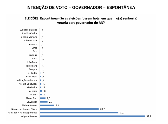 No cenário espontâneo para governador — aquele que não é sugerido qualquer nome ao entrevistado —, o atual prefeito de Mossoró, Allyson Bezerra destaca-se com 37,1% das intenções de voto, e a um ano de meio do pleito de 2026, quase metade dos eleitores não mencionou qualquer nome: Não Sabe/Não Respondeu (27,7%); Ninguém/Branco/Nulo (20,7%). A governadora Fátima Bezerra, que em seu segundo mandato consecutivo não poderá ser candidata ao cargo, reuniu 5,1% das intenções de voto e o senador Styvenson Valentim, com 2,7%. Álvaro Dias, ex-prefeito de Natal (atualmente sem mandato), é citado por 2% dos eleitores ouvidos.