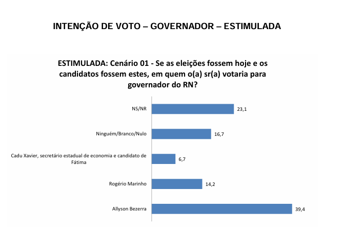 Na estimulada, ainda para governador, o Instituto Seta sugeriu os nomes de Allyson Bezerra, o senador Rogério Marinho e Cadu Xavier, secretário estadual de Fazenda e candidato da governadora Fátima. O prefeito de Mossoró, segundo maior colégio eleitoral, lidera com 39,4%, seguido pelo senador Rogério Marinho, com 14,2%. Cadu Xavier, único entre os três que não ocupa cargo eletivo, é citado por 6,7% dos eleitores ouvidos pelo Instituto.