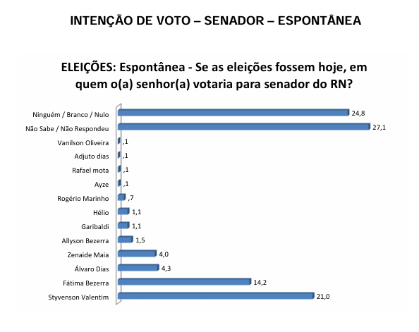 Na espontânea para o cargo de senador, Styvenson Valentim lidera, com 21%, seguindo pela governadora Fátima Bezerra (14,2%). Em seguida, Álvaro Dias (4,3%) e Zenaide Maia (4%).