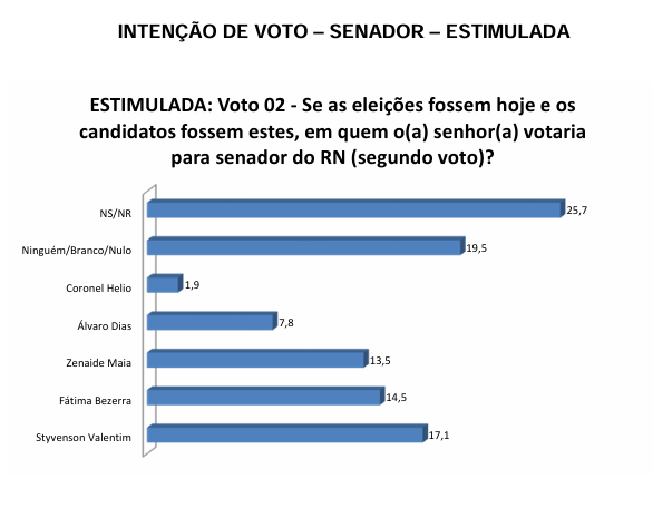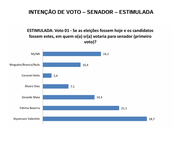 Estimulada/Voto 1: Quando sugeridos nomes de eventuais candidatos ao senado — pesquisa estimulada (primeiro voto) —, Styvenson Valentim (28,7%) e Fátima Bezerra (21,1%) lideram, seguidos por Zenaide Maia (14,3%) Álvaro Dias (7,1%), os quatro nomes mais votados. Ninguém/Branco/Nulo (10,4%) e Não Sabe/Não Respondeu (16,1%), representando mais de ¼ dos eleitores ouvidos.