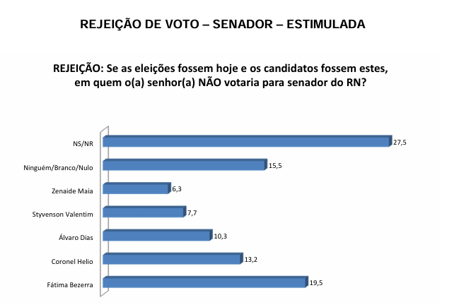 Rejeição de Voto/Senador – Estimulada: A governadora Fátima Bezerra obteve 19,5% das intenções de voto, seguida por Coronel Helio (13,2%), Álvaro Dias (10,3%), Styvenson Valentim (7,7%) e Zenaide Maia (6,3%).