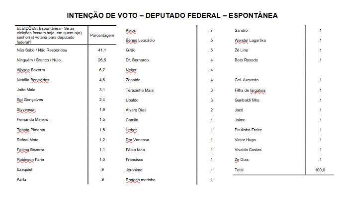 A pesquisa também apurou em quem o eleitor votaria para deputado federal do Rio Grande do Norte, e se as eleições fossem hoje. Allyson Bezerra (6,7%), Natália Bonavides (4,6%), João Maia (3,1%) e Sargento Gonçalves (2,4%), Styvenson Valentim (1,9%), Fernando Mineiro (1,5%), Tabata Pimenta (1,5%) e Rafael Mota (1,2%) foram os mais citados pelos eleitores entrevistados.