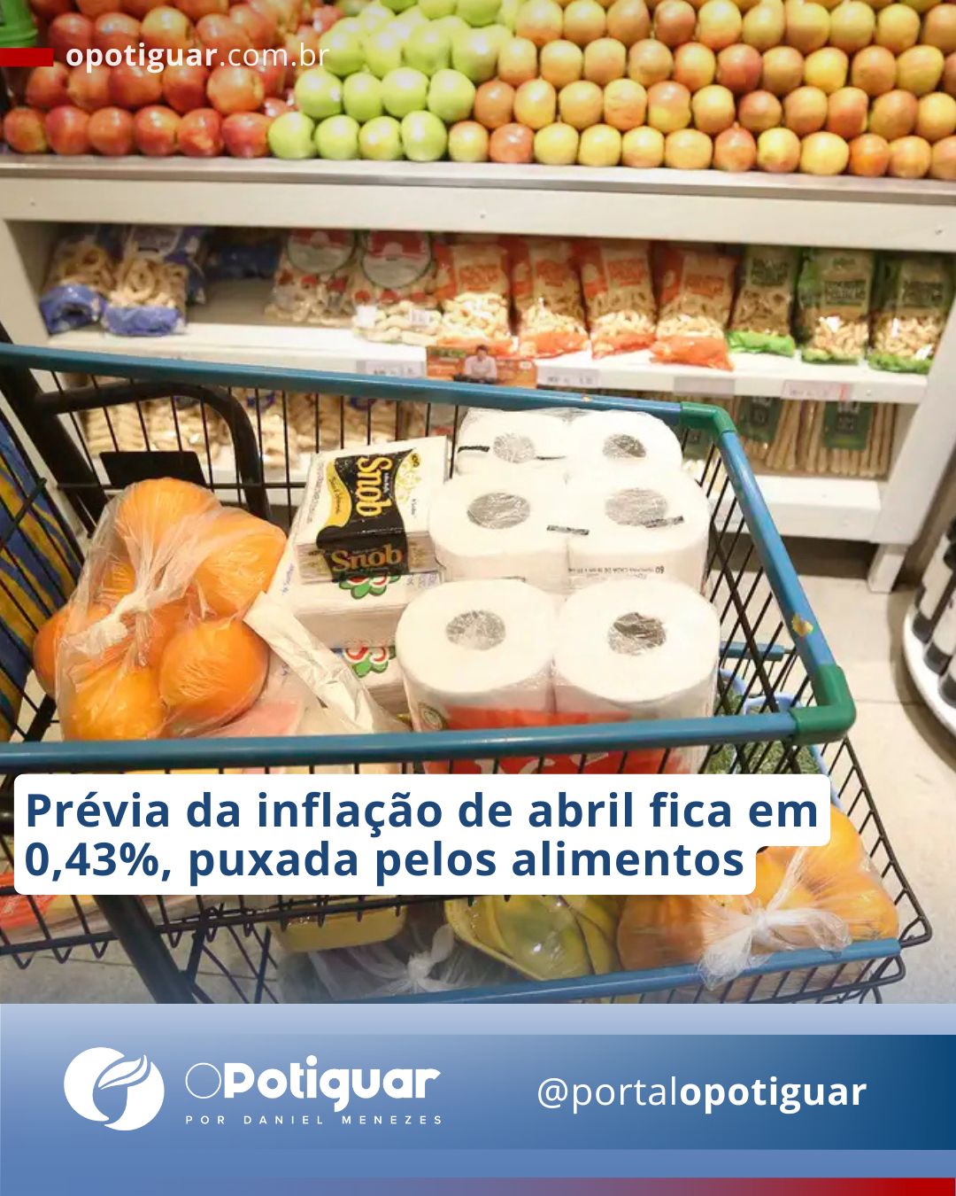 A prévia da inflação oficial registrou 0,43% em abril, pressionada pelos preços dos alimentos e itens de saúde. O resultado, apurado pelo Índice Nacional de Preços ao Consumidor Amplo 15 (IPCA-15), representa desaceleração em relação a março, quando ficou em 0,64%.