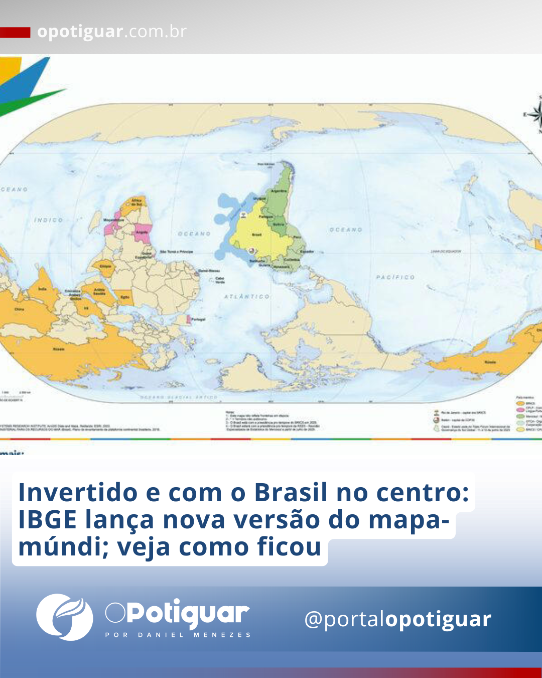 Do Estadão - Após lançar um mapa-múndi com o Brasil no centro do mundo, em 2024, o Instituto Brasileiro de Geografia e Estatística (IBGE) anunciou uma nova versão, desta vez com a perspectiva invertida: o Brasil permanece no centro do globo, mas o sul figura no topo da imagem.