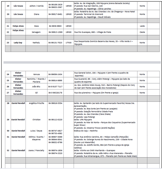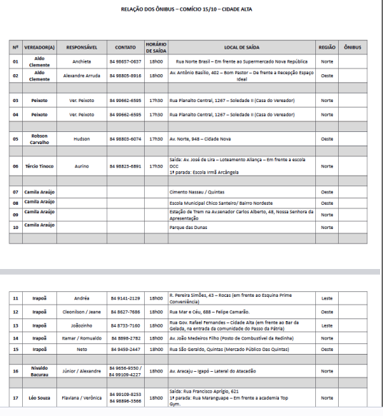 Na conclusão do MPE, na análise da evidência B7110, dados coletados em computador da Secretária Municipal de Trabalho e Assistência Social - SEMTAS de Natal/RN, foi encontrado 1 (um) arquivo de possível relevância para a investigação, tratando-se de provável relação de ônibus para transporte a comício ocorrido no dia 15 de outubro de 2024, citando diversos vereadores, entre eles, os investigados DANIEL RENDALL e IRAPOÃ NÓBREGA.