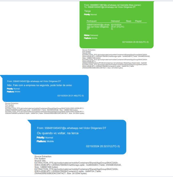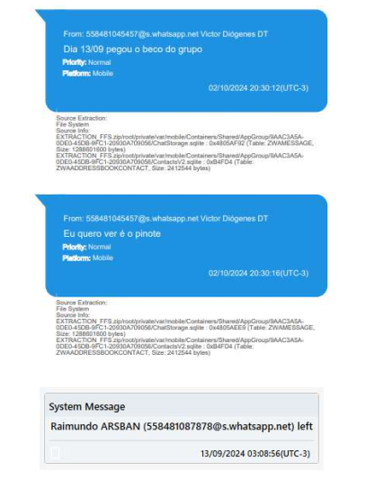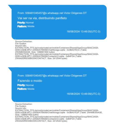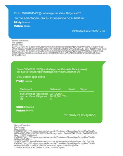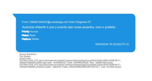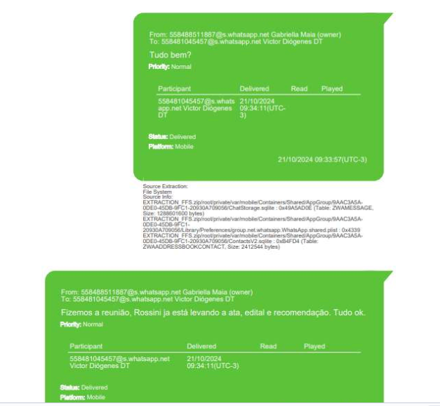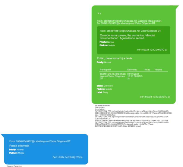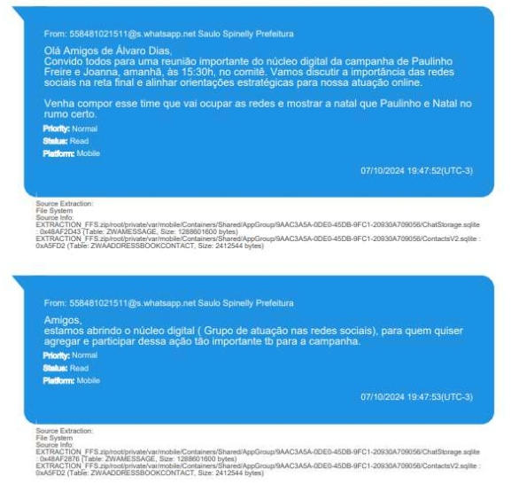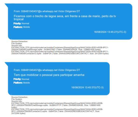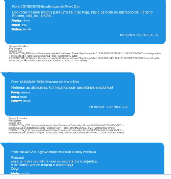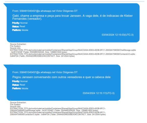 Com base na análise parcial dos dados extraídos do vestígio digital B5430, com foco nos chats do aplicativo de mensagens WhatsApp, e concentrando-se no período de 01 de janeiro de 2024 a 05 de dezembro de 2024, identificaram-se, conforme o Gaeco, diversos trechos de conversas relevantes para a investigação em curso. A análise concentrou-se em mensagens trocadas entre Gabriela Emerenciano Maia e Victor Matheus Diógenes Ramos de Oliveira Freitas, bem como em mensagens do grupo "AMIGOS DA VITÓRIA 2024". Nas conversas entre Gabriela e Victor, foram identificadas possíveis demissões em razão de motivos políticos, como de Jansen Cavalcanti e Raimundo Justino Filgueira de Lima. Há indícios da prática de liberação de servidores para eventos políticos em horário de expediente. Também foram encontradas conversas sobre a mobilização de servidores para eventos políticos, diz o MP.