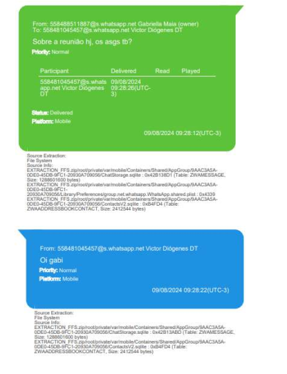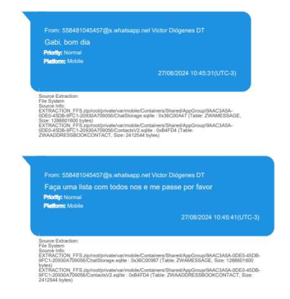 Noutro trecho selecionado pelo MP, em conversa ocorrida em 21 a 25 de outubro de 2024, data em que VICTOR DIÓGENES estaria fora do cargo de direção na ARSBAN, infere-se que GABRIELLA EMERENCIANO enviava informações de rotina do órgão a VICTOR DIÓGENES, e que o ex-diretor, inclusive, passava ordens de expediente à GABRIELLA.