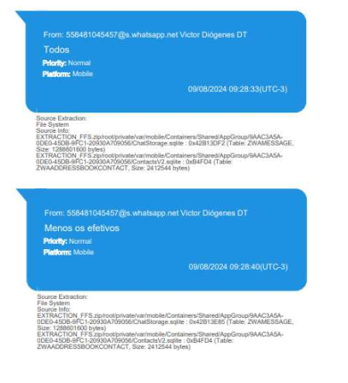 Em novo trecho de diálogo no chat capturado pelo Gaeco, conversa ocorrida em 27 e 28 de agosto de 2024 entre os dois participantes, foi inferido pelo MPE que possivelmente VICTOR DIÓGENES pediu pra GABRIELLA EMERENCIANO fazer um levantamento do nome, função e vencimentos dos servidores do quadro, a fim de saber, de acordo com suas condições financeiras, quais servidores poderiam participar de mais ou menos eventos/reuniões. Além disso, o chat mostra que VICTOR DIÓGENES pediu que GABRIELLA EMERENCIANO adicionasse o servidor Raimundo Justino Filgueira de Lima a um grupo e que após a adição do participante ela poderia enviar uma agenda. E em pesquisa e análise de contexto da evidência, foi verificado que Raimundo trabalhava dando suporte de tecnologia da informação ao órgão. A evidência também mostrou que o grupo em que Raimundo foi adicionado no dia 28 de agosto de 2024 tratava-se do grupo “AMIGOS DA VITÓRIA 2024”.