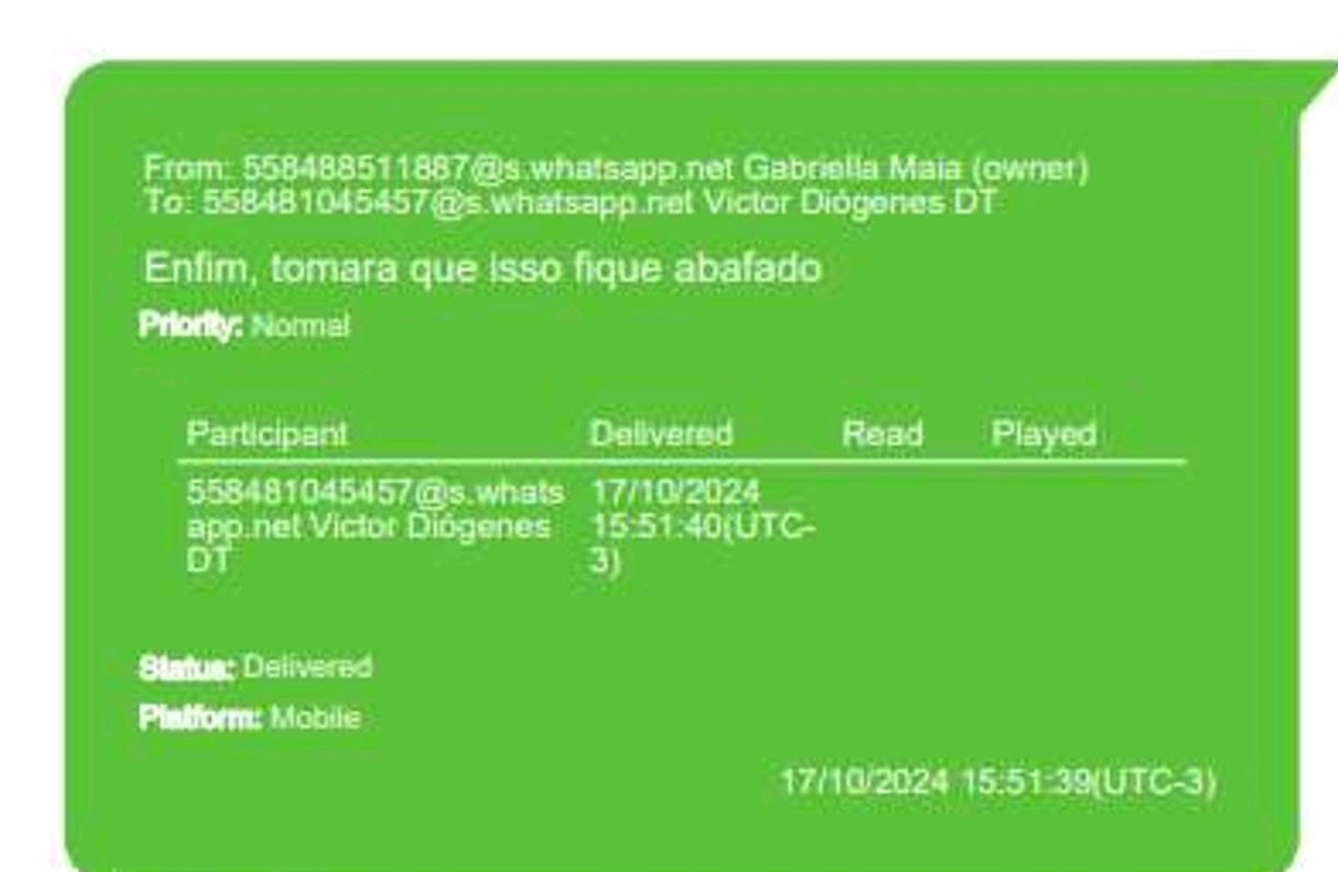 Os diálogos, obtidos com exclusividade pelo O Potiguar, mostram que Victor Diógenes encaminhou a matéria da CNN para Gabriella. A servidora respondeu acreditando que um ex-comissionado teria ligação com o vazamento de um áudio comprometedor — o estopim para a renúncia de Victor da Arsban. Em seguida, ela complementa: "Enfim, tomara que isso fique abafado."