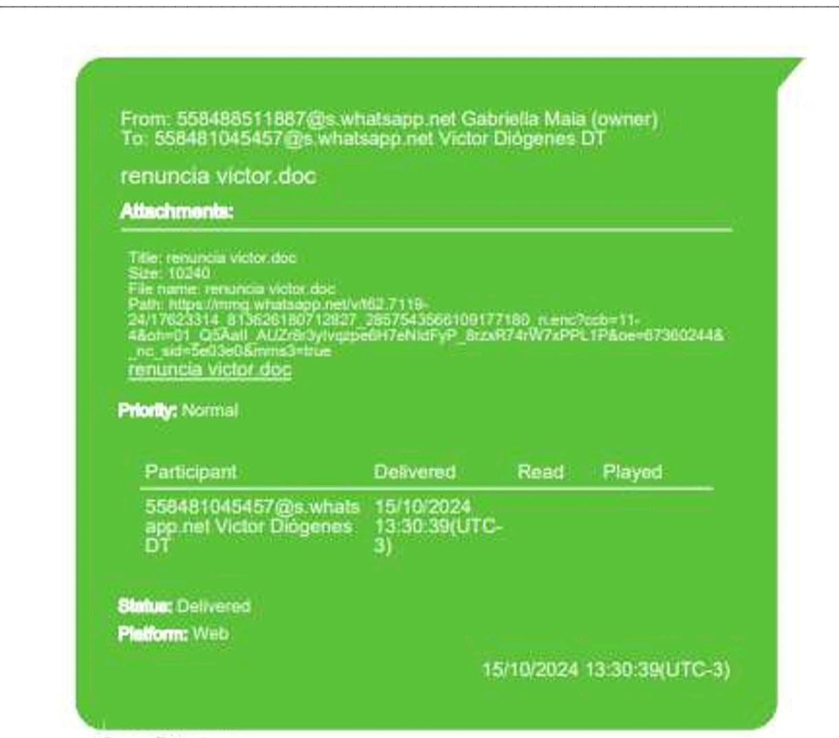 Víctor Diógenes aparece em uma conversa com a servidora identificada como Gabriella Emerenciano. Ela encaminhou no dia 15, antes da publicação da matéria, a minuta de renúncia de Victor, que já previa a repercussão negativa do furo jornalístico da CNN.