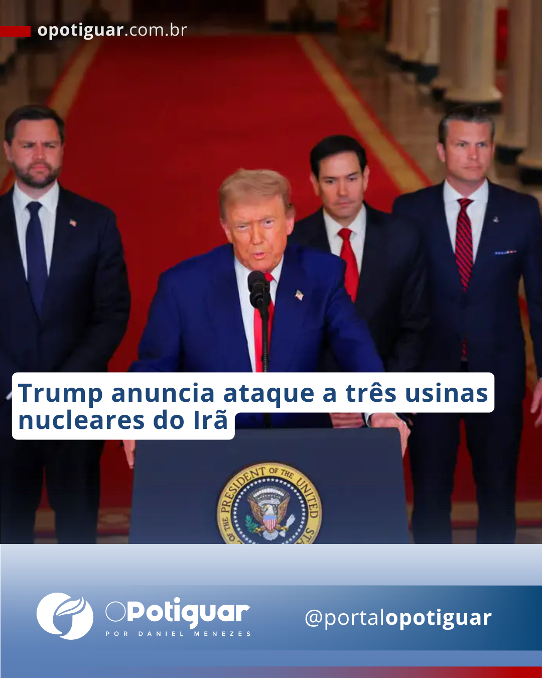 O presidente dos Estados Unidos, Donald Trump, publicou em suas redes sociais um anúncio de ataque a três usina nucleares iranianas: Fordow, Natanz e Esfahan. De acordo com ele, os bombardeios foram realizadas por militares norte-americanos, que já estariam fora do espaço aéreo do país. O principal alvo das bombas teria sido a usina de Fordow.