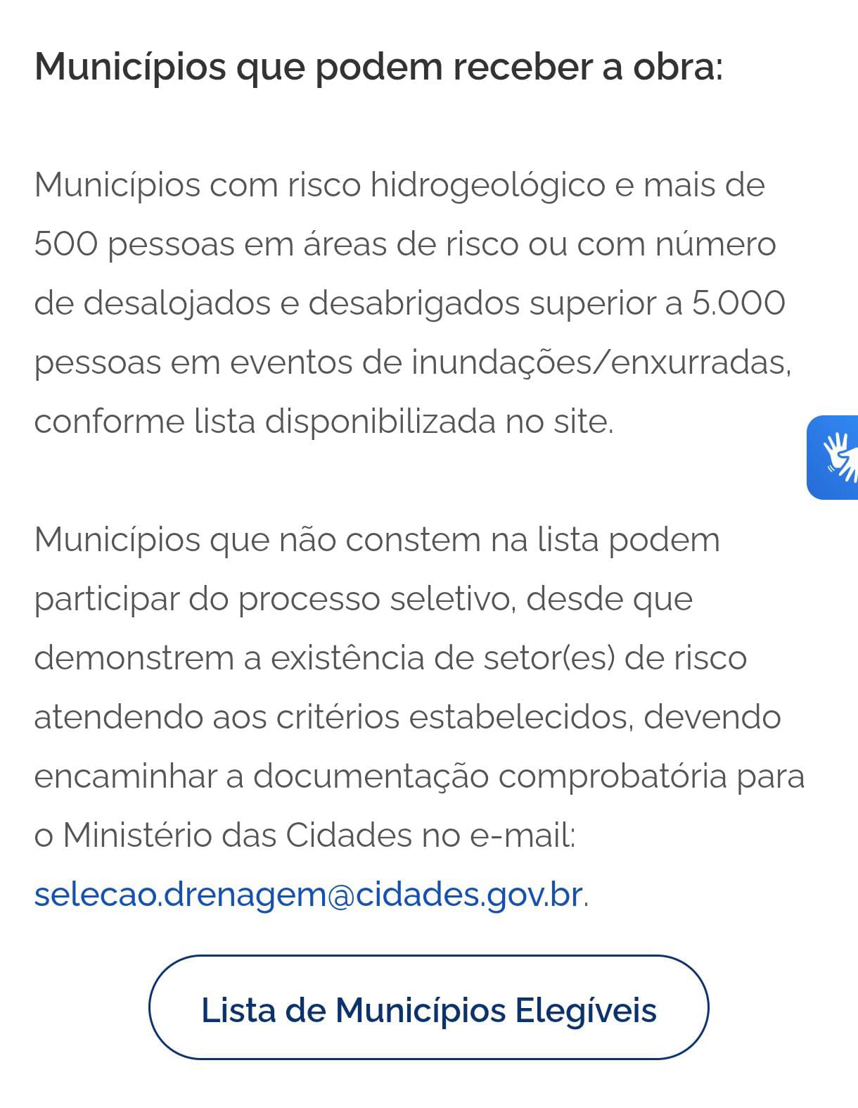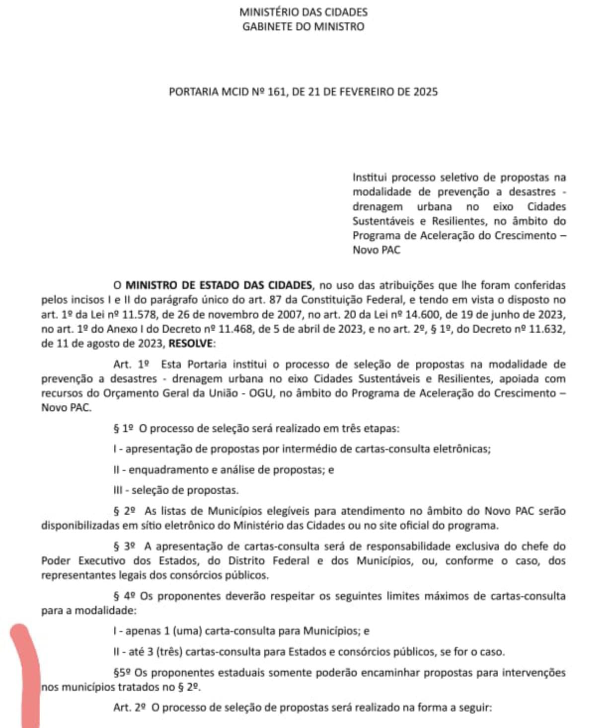 Cabe, por fim, lembrar que o governo do estado já havia feito um chamamento público para que as prefeituras, que têm a incumbência de resguardar a drenagem das cidades e vincular ações aos seus planos no segmento, enviassem propostas e disponibilizou sua equipe técnica para auxiliar os municípios. A própria portaria do ministério das cidades vincula a proposição do ente estadual aos municípios elegíveis para recebimento de investimentos, conforme a seleção que é direcionada para cidades com riscos hidrogeológicos.