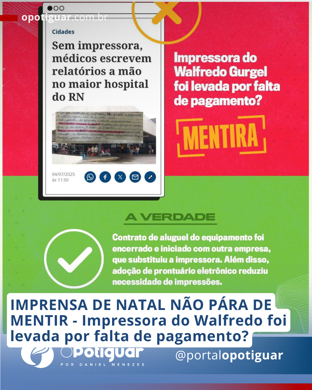 É falsa a notícia que circula no WhatsApp e que diz que a impressora utilizada pelos médicos no Hospital Monsenhor Walfredo Gurgel foi recolhida por uma prestadora de serviço por falta de pagamento. A informação foi desmentida pela Secretaria de Estado da Saúde Pública (Sesap).