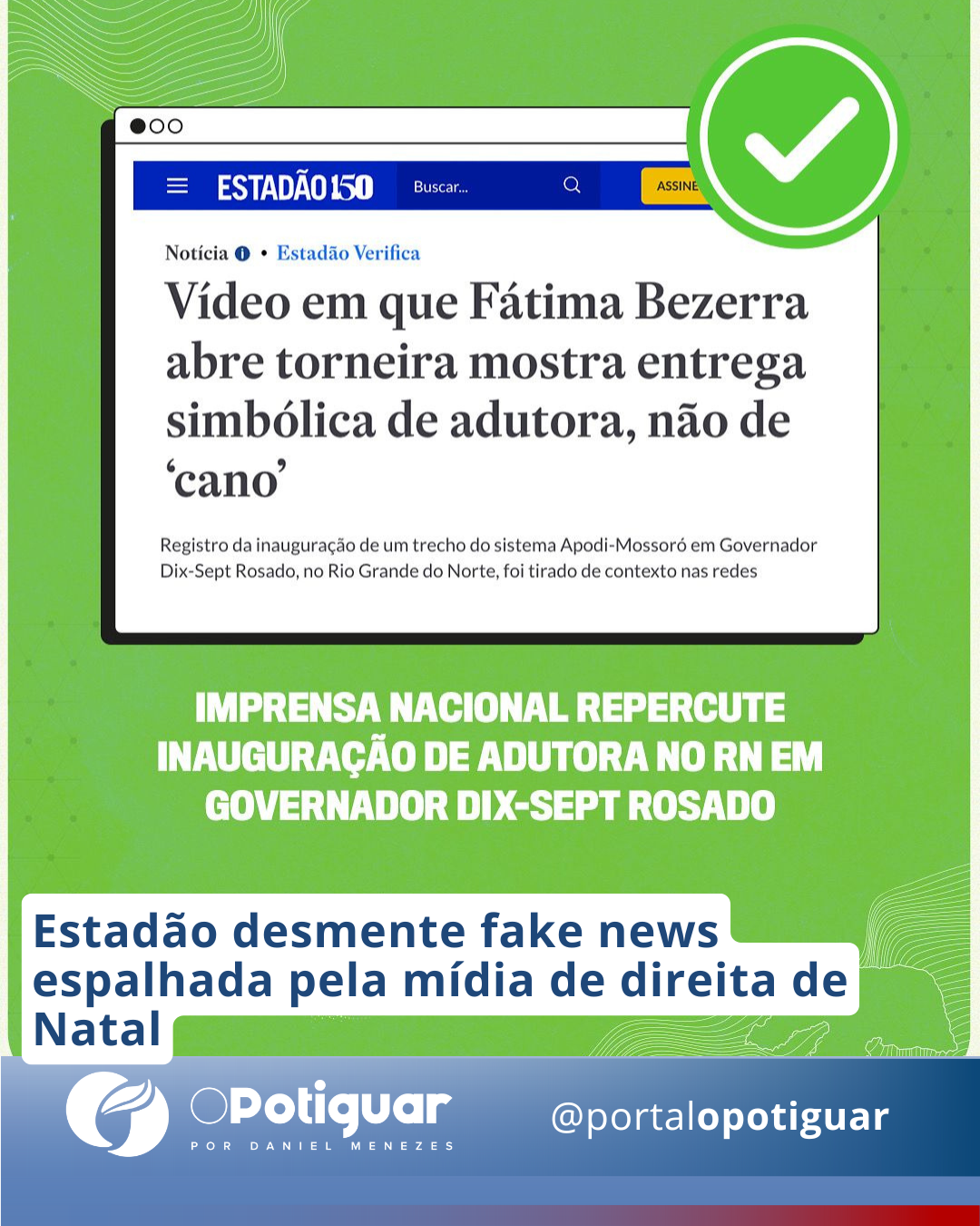 O “Estadão Verifica”, serviço de checagem de notícias do jornal “O Estadão”, confirmou que a governadora Fátima Bezerra não inaugurou “um cano”, como circulou em fake news compartilhada nas redes sociais na última semana, mas sim uma adutora para abastecimento de água no município de Governador Dix-Sept Rosado, beneficiando 11 mil moradores daquele município da região Oeste Potiguar.
