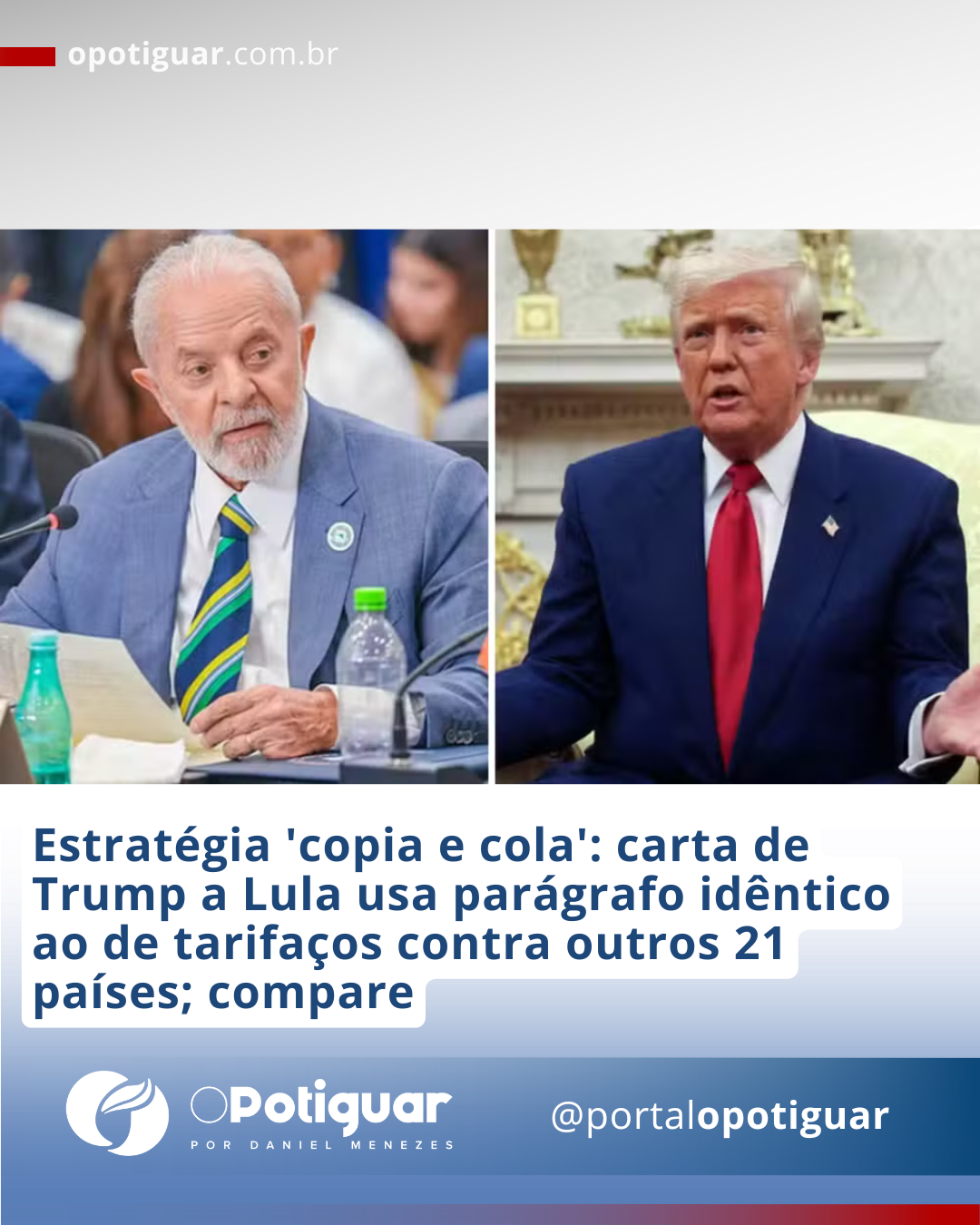 G1 - Em uma carta enviada ao presidente Lula para anunciar tarifas de 50% sobre produtos brasileiros, Donald Trump usou um parágrafo idêntico ao que aparece em documentos enviados a outros 21 países. O trecho ameaça impor novas taxas caso o Brasil reaja e justifica a medida com um suposto risco à segurança nacional dos Estados Unidos. Compare mais abaixo.