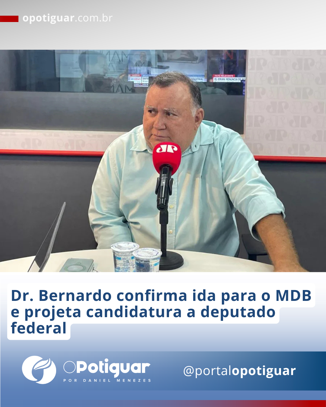 O deputado estadual Dr. Bernardo, atualmente no PSDB, confirmou que irá se transferir para o MDB durante entrevista ao programa Jornal da Manhã, da Jovem Pan Natal, nesta quarta-feira (23). Ele também confirmou que o seu desejo é lançar uma candidatura a deputado federal nas eleições de 2026.