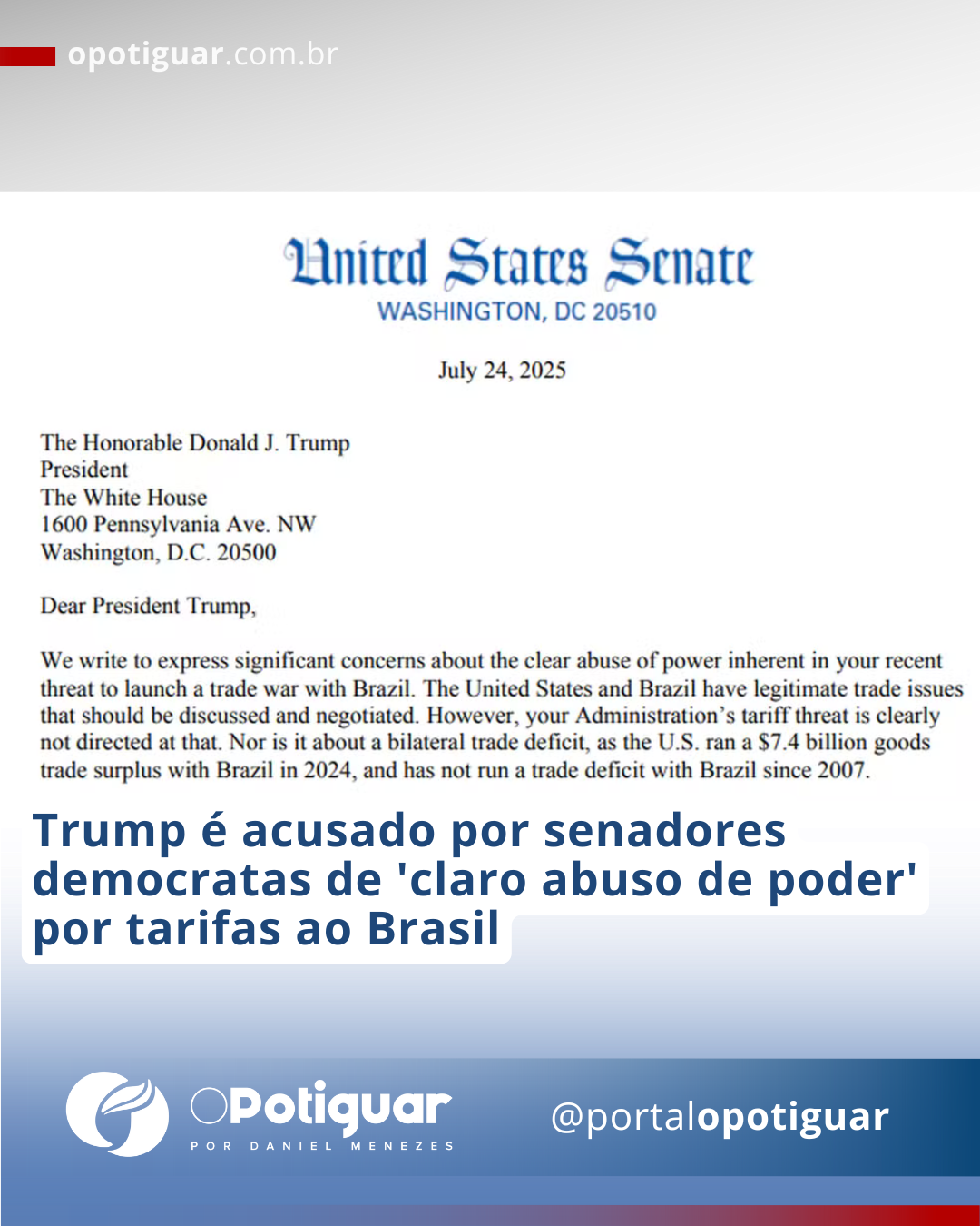 Escrevemos para expressar sérias preocupações sobre o claro abuso de poder presente em sua recente ameaça de iniciar uma guerra comercial com o Brasil. Os Estados Unidos e o Brasil têm questões comerciais legítimas que devem ser discutidas e negociadas. No entanto, a ameaça de tarifas feita por sua administração claramente não se refere a isso. Tampouco se trata de um déficit comercial bilateral, já que os EUA tiveram um superávit de US$ 7,4 bilhões em bens com o Brasil em 2024 e não registram déficit comercial com o país desde 2007.