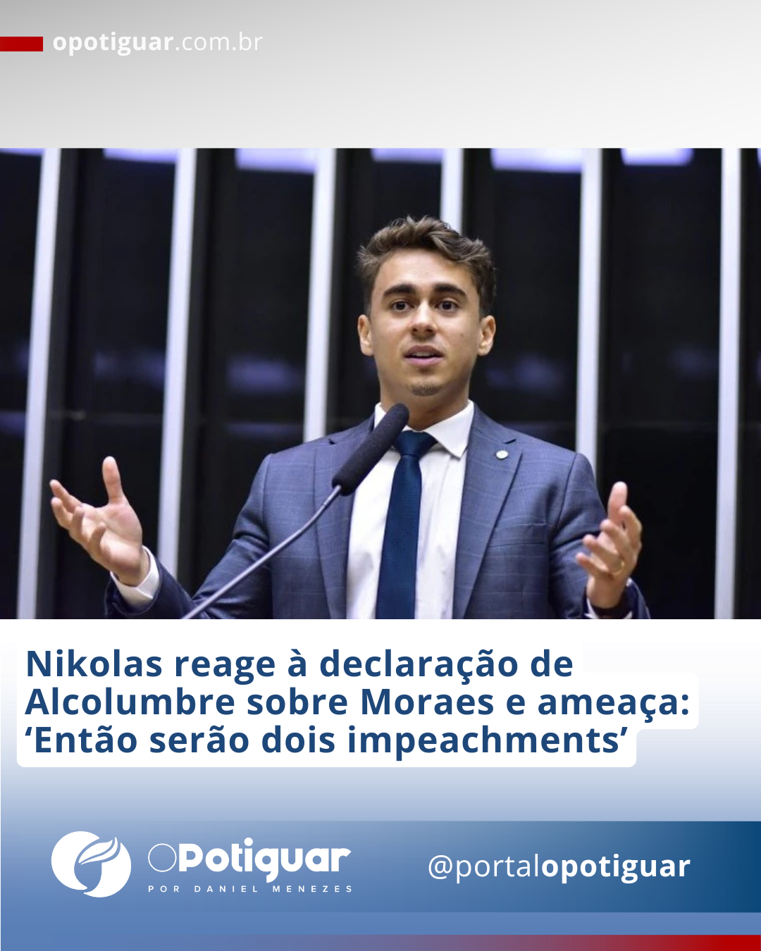 O deputado federal Nikolas Ferreira (PL-MG) reagiu à declaração do presidente do Senado, Davi Alcolumbre (União-AP), de que não dará andamento ao pedido de impeachment do ministro Alexandre de Moraes, do Supremo Tribunal Federal (STF), de jeito nenhum. A mensagem do senador foi revelada pela Coluna do Estadão.