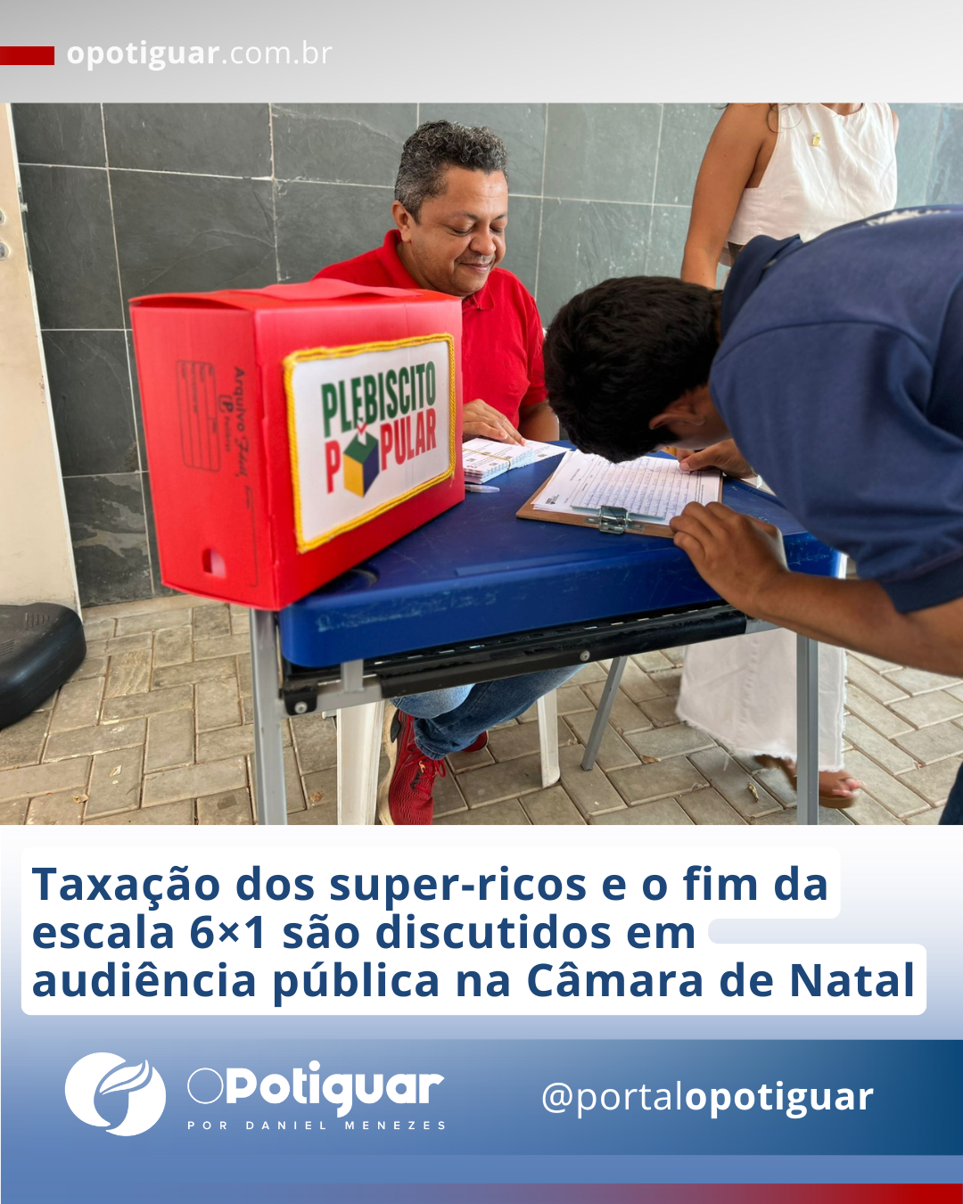E ainda dentro dessa proposta de mobilização popular, o mandato da vereadora Brisa Bracchi está reforçando a campanha do Plebiscito Popular sobre a taxação do super-ricos e o fim da escala. Até o próximo sábado (16), a urna montada pelo mandato vai circular por Natal, Extremoz e Ceará-Mirim coletando os votos da população. Qualquer cidadão pode buscar as urnas e se manifestar respondendo sim ou não a duas perguntas: "você é a favor da redução da jornada de trabalho, sem redução salarial, e do fim da escala 6x1?" e "você é a favor de que quem ganhe mais de R$ 50 mil pague mais imposto para quem recebe até R$ 5 mil não pague imposto de renda?".