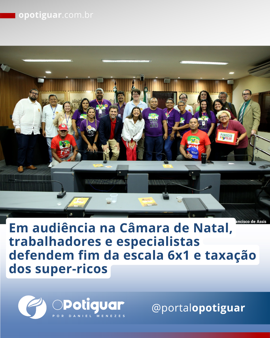 Durante a audiência também foram coletados votos do plebiscito popular, através da urna viabilizada pelo mandato de Brisa Bracchi. A urna já circulou por pontos de Natal, Ceará-Mirim e Extremoz nos dias recentes. Qualquer cidadão pode buscar as urnas e responder às duas perguntas do plebiscito: "você é a favor da redução da jornada de trabalho, sem redução salarial, e do fim da escala 6x1?" e "você é a favor de que quem ganhe mais de R$ 50 mil pague mais imposto para quem recebe até R$ 5 mil não pague imposto de renda?". A votação do Plebiscito Popular está aberta em todo o Brasil desde o dia 1º de julho e segue até setembro. Os resultados da manifestação popular serão encaminhados ao presidente Lula, ao Congresso Nacional e ao Supremo Tribunal Federal (STF).