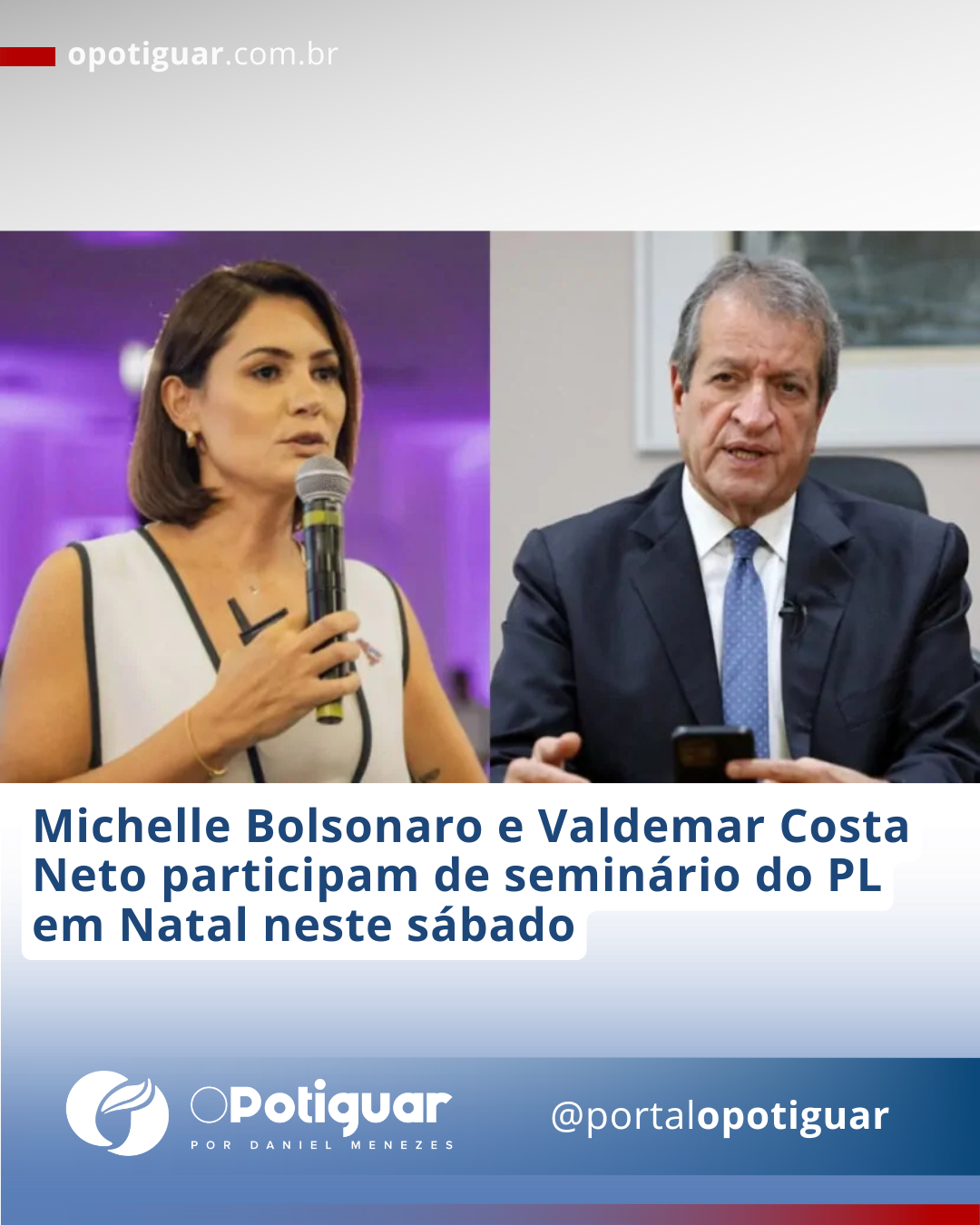 A ex-primeira-dama Michelle Bolsonaro e o presidente nacional do Partido Liberal (PL), Valdemar Costa Neto, estarão em Natal neste sábado 16 para o Seminário Rota 22. O encontro ocorre a partir das 8h no Olimpo Recepções, em Candelária, com acesso aberto ao público.