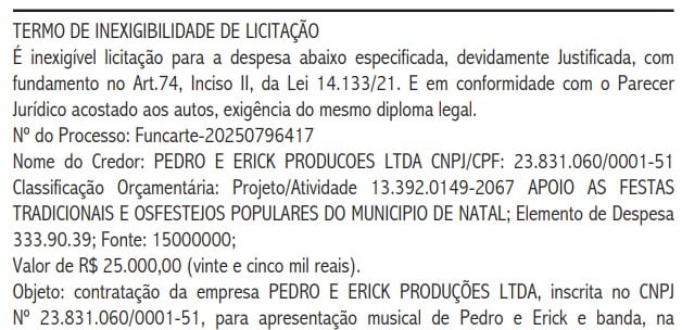 Destaque para para a vereadora Nina Souza, que gastou 25 mil reais em emenda endereçada em 2024 e realizada agora em 2025 com festa junina privada/fechada no restaurante Tabua de Carne na via costeira. A contratação foi feita com dispensa de licitação via Fundação Cultural Capitania das Artes (Funcarte). Conforme matéria do Saiba Mais, a destinação traz a assinatura de Iracy Gois de Azevedo, presidente da Funcarte. A verba foi alocada como “APOIO AS FESTAS TRADICIONAIS E OS FESTEJOS POPULARES DO MUNICIPIO DE NATAL”.