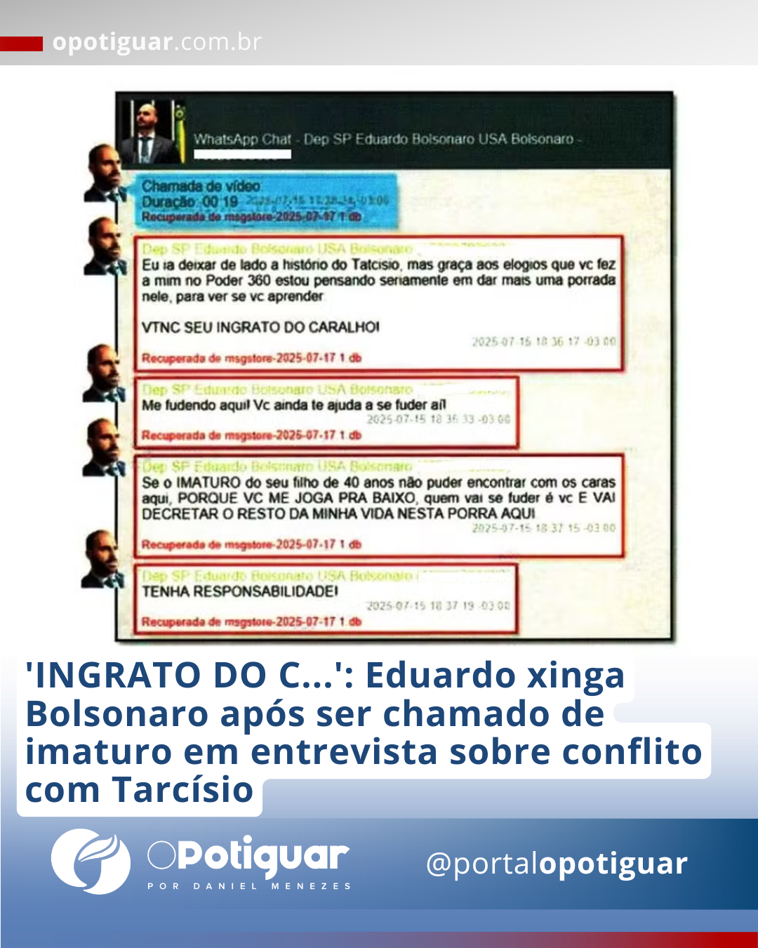 Mensagens analisadas pela Polícia Federal (PF) e citadas em relatório divulgado nesta quarta-feira (20) mostram que o deputado Eduardo Bolsonaro (PL-SP) xingou o pai Jair Bolsonaro após entrevista do ex-presidente sobre o conflito do filho com o governador de São Paulo, Tarcísio de Freitas (Republicanos). Segundo a PF, Eduardo demonstrou irritação com as declarações do pai.
