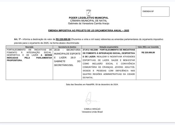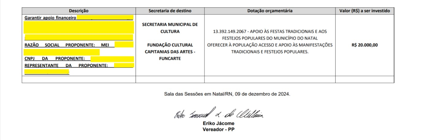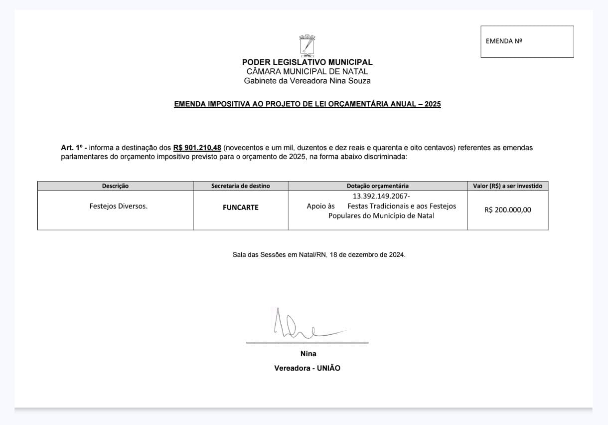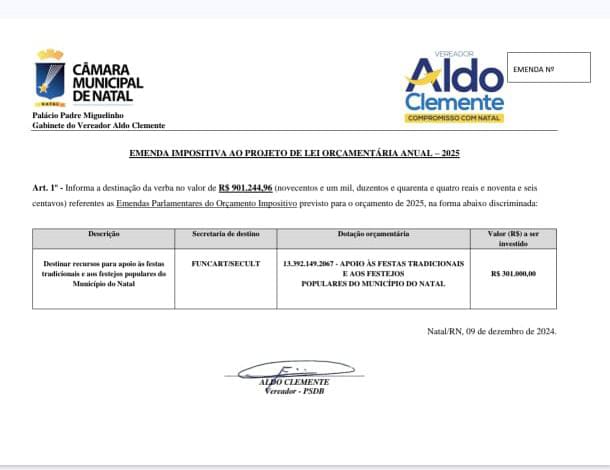 Os vereadores têm direito a cerca de 900 mil reais em emendas impositivas. Cerca de 60% dos recursos estão sendo destinados pelos parlamentares para a área de eventos e festejos populares a partir da execução da Fundação da Capitania das Artes - Funcarte - da Prefeitura do Natal.