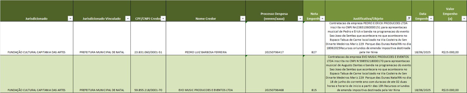 Veja a tabela do Tribunal de Contas do Estado a seguir já com o pagamento efetuado por Nina Souza para dois shows em restaurante fechado na via costeira. Pela indicação da emenda, não tem como saber como o dinheiro vai ser especificamente executado.