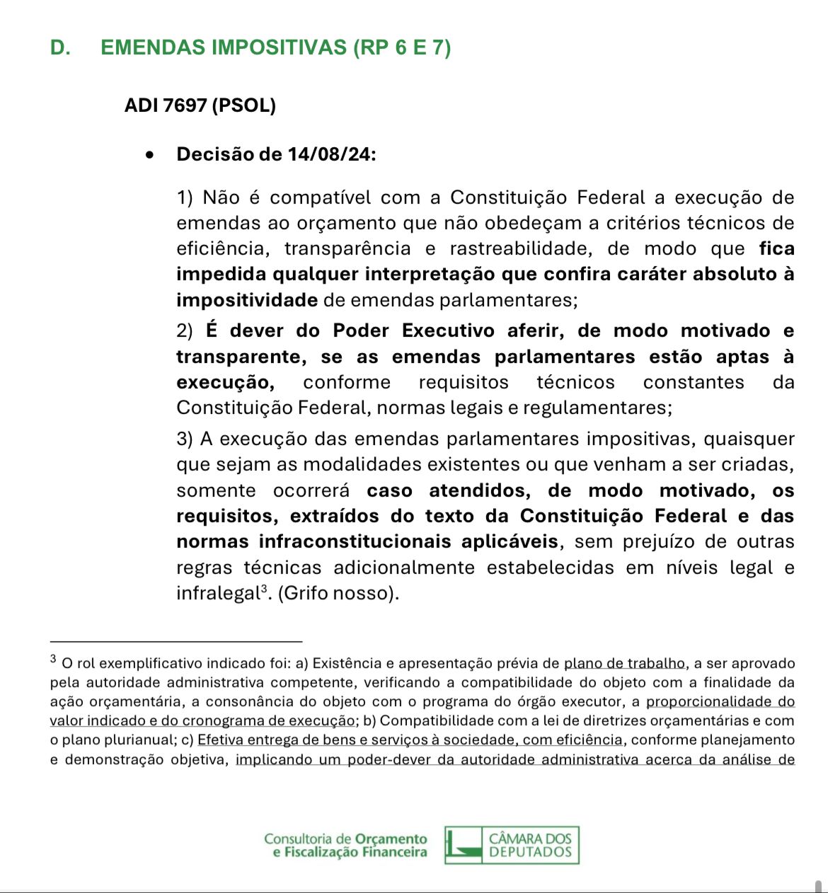 Como fundamento, ele me mandou a mais recente decisão do Supremo Tribunal Federal a respeito do assunto. Normatizando o uso transparente das emendas impositivas na câmara e no senado, o STF estabeleceu em decisão que a imposição de pagamento de emendas não é absoluta, pois depende de critérios legais, técnicos, de transparência e rastreabilidade.