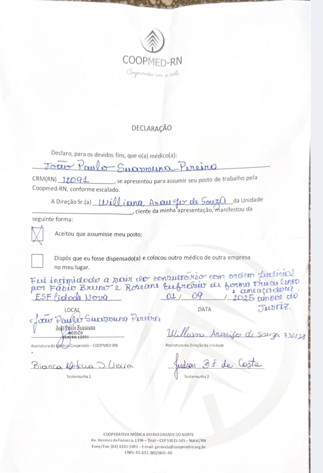 O médico prestou queixa contra seguranças da justiz. Ele alega que foi retirado do consultório de uma Unidade de saúde de Natal com truculência e ameaças. Além do relato oficial com testemunhas registradas, ele apresentou comunicação de fato à polícia.