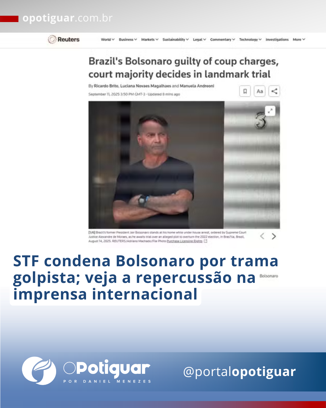 - Reuters: destacou que Bolsonaro é o primeiro ex-presidente condenado por atentado à democracia.