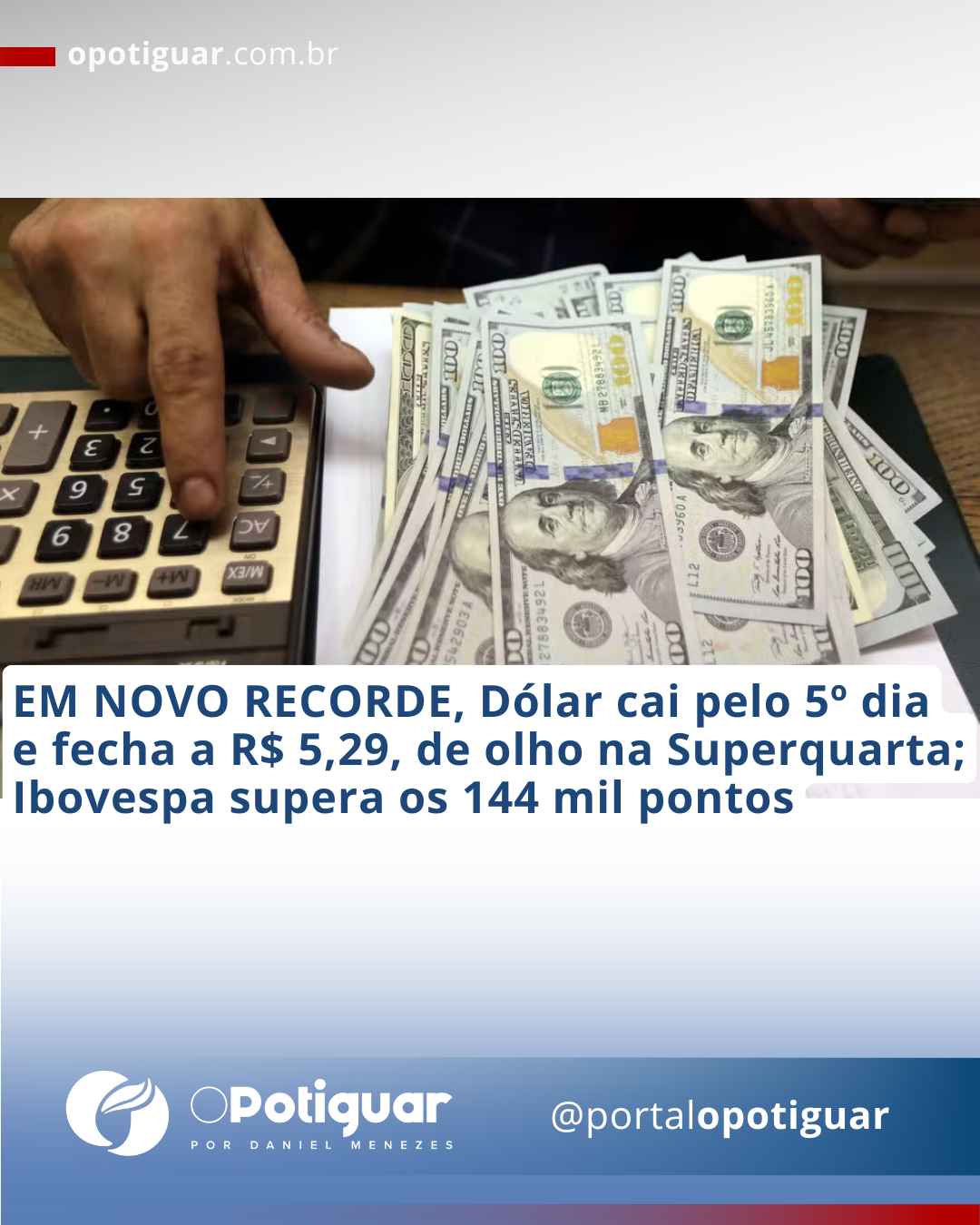 EM NOVO RECORDE, Dólar cai pelo 5º dia e fecha a R$ 5,29, de olho na Superquarta; Ibovespa supera os 144 mil pontos