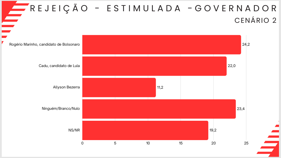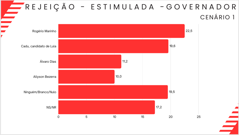 No critério de rejeição, Rogério Marinho é o mais rejeitado, seguido por Cadu. Tal inclinação ocorre no cenário com estimulado rejeição com e sem o pré-candidato Alvaro Dias.