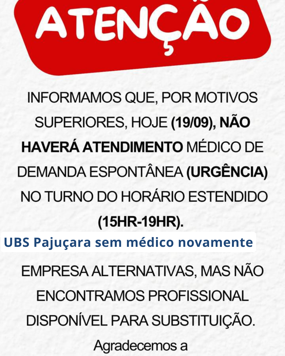 A Unidade Básica de Saúde de Pajuçara informou que está sem médico na urgência. Conforme o informe feito nas redes sociais, a empresa terceirizadora não encontrou profissionais para ocupar a escala. É a segunda vez esta semana.