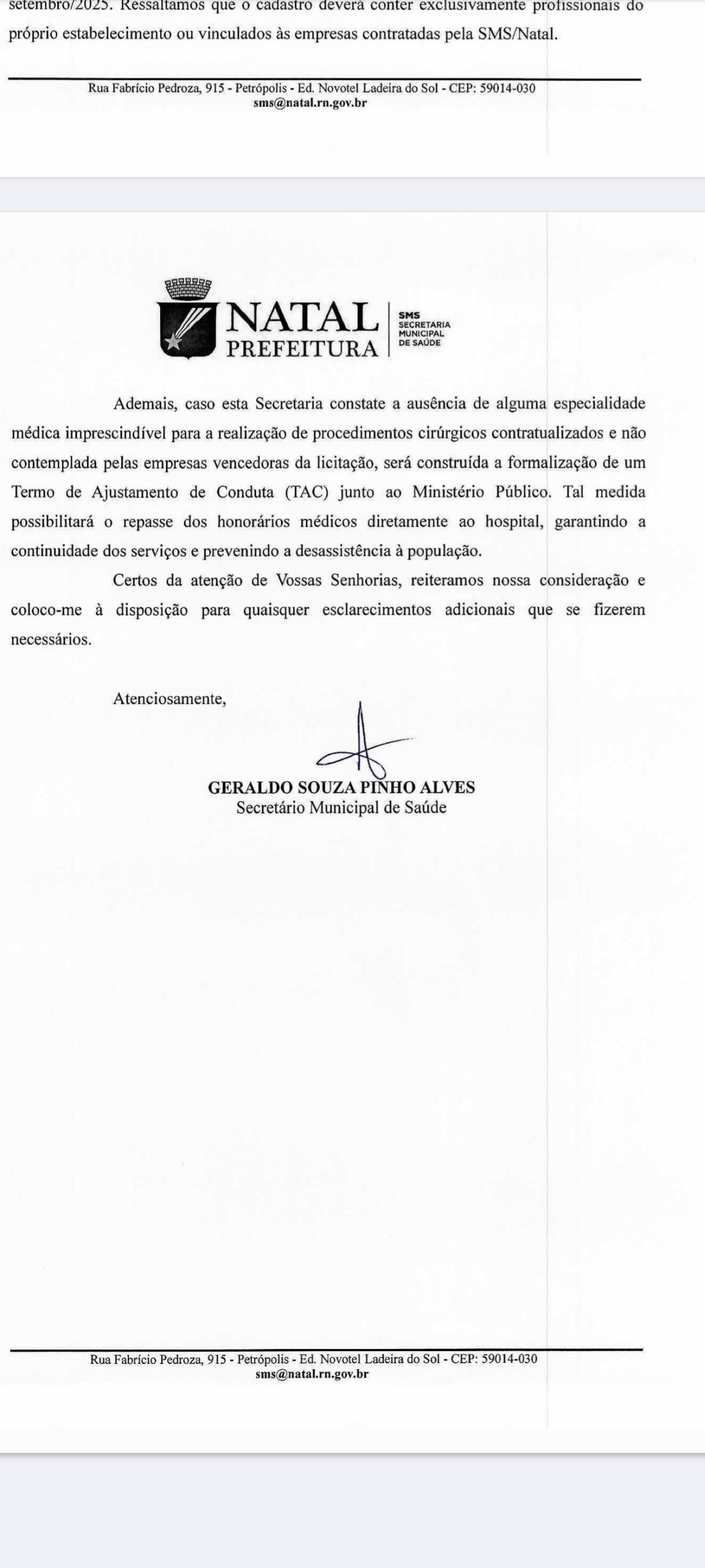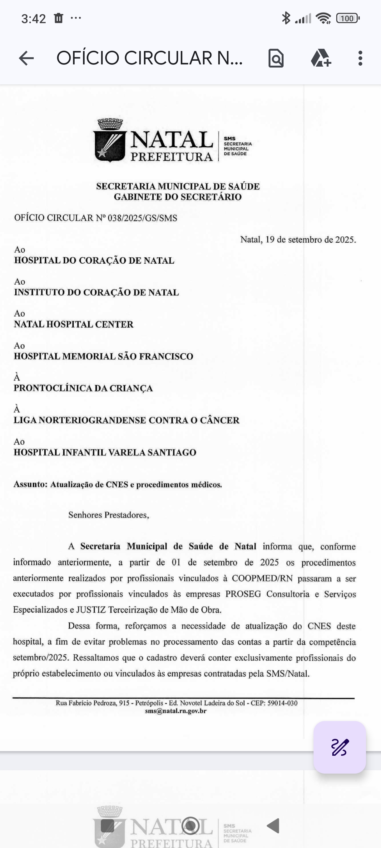 A Prefeitura do Natal tenta equacionar a efetivação de procedimentos médicos em hospitais que prestam serviço ao município. Em informe circular feito pela prefeitura aos diretores de hospitais da capital no último dia 19, o secretário de saúde Geraldo Pinho enfatizou que a partir de Setembro de 2025 as organizações citadas não devem dispor de médicos da Coopmed, mas das terceirizadas Justiz e Proseg ou ainda do próprio hospital.