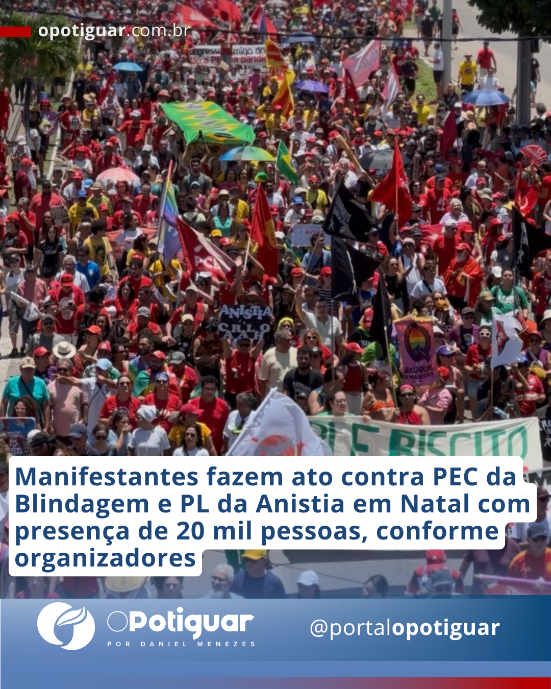 Do G1 - Manifestantes realizaram um ato na manhã deste domingo (21), em Natal, contra o projeto de emenda à constituição que ficou conhecido como PEC da Blindagem e contra o projeto de lei para anistia a pessoas condenadas pela tentativa de golpe de estado.