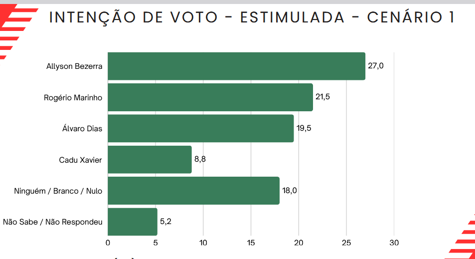 Pesquisa Seta para o Governo realizada em Touros mostrou a liderança de Allyson Bezerra também no questionamento estimulado. Ele está com 27%, seguido de Rogério Marinho com 21,5% e Álvaro Dias com 19,5%.