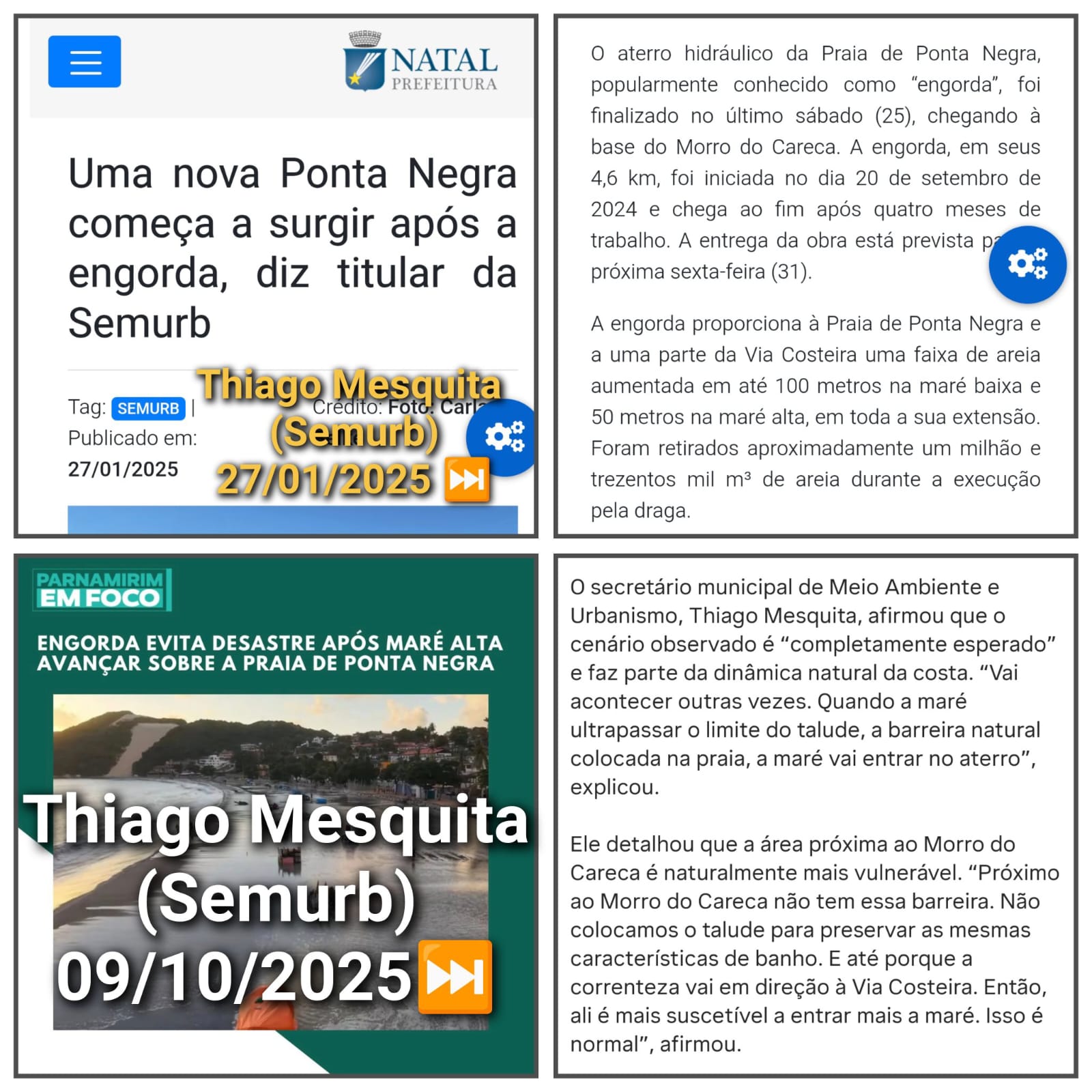 Veja a seguir uma publicação da prefeitura do Natal de Janeiro de 2025 e uma feita esta semana, através do secretário de meio ambiente e urbanismo de Natal Thiago Mesquita.
